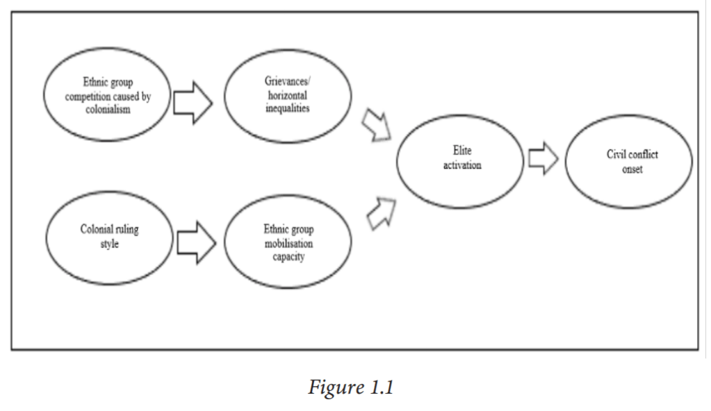 This section will take the following structure: first, it will outline the theories linking colonialism to ethnic grievances, before reviewing the key scholarship of grievance explanations for civil conflict, with a brief discussion of the alternative theories. Then, it will present an alternative strand of literature linking colonialism to conflict, which examines the structural effects of colonialism on political structures, before summarising the academia linking these structural effects to mobilisation capabilities. The third part will then present the literature on linking theories of grievances and theories of mobilisation capacity. The next section gives a brief review of the scholarship on elite activation, which is seen as the main instigator of ethnic conflict. The final part will present the literature in a novel hypothesised causal chain, explaining the inferences made which links the scholarship and outlining its academic and practical significance.